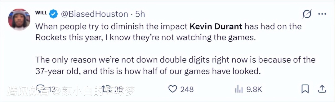 赛后休媒Will为KD辩护:当有人试图贬低杜兰特对火箭的影响时,我们都知道那些人根本没有看比赛。我们至今都还没有跌出前三都是因为这位37岁的球星,我们半数以上的比赛都是这个情况。