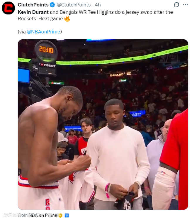 这场比赛后杜兰特与NFL球星泰-希金斯互换了球衣,杜兰特还在自己的球衣上进行了签名。虽然火箭队输球了,可杜兰特这场比赛却可以昂首离开,他的个人表现非常出色。
