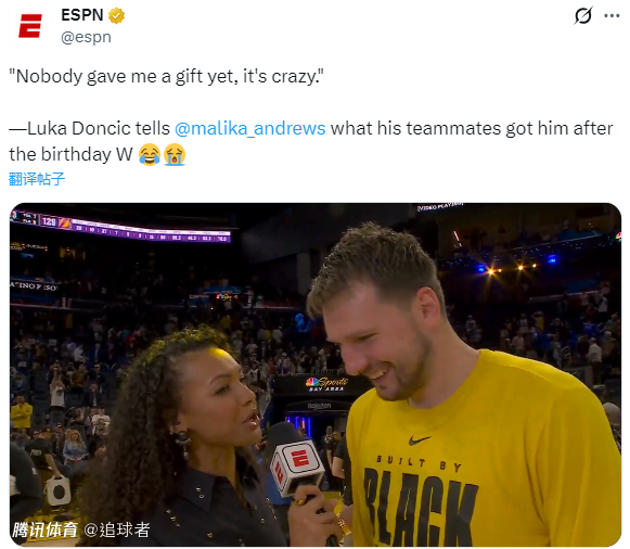 东契奇连续第3次在生日夜赢球,赛后被问到是否收到什么有趣的礼物时,东契奇表示:我还没有收到任何队友给我的礼物,这真是太疯狂了。