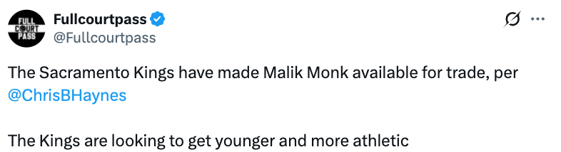 北京时间12月24日, 据名记Chris Haynes报道,萨克拉门托国王队已将蒙克摆上交易货架。国王队的目标是打造更年轻、运动能力更强的阵容。