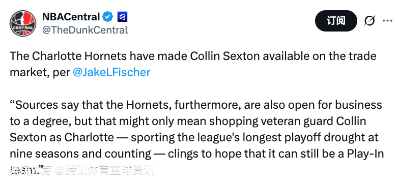 北京时间12月24日,据美记Jake Fischer报道,夏洛特黄蜂队已将塞克斯顿摆上交易货架,明尼苏达森林狼队是其的潜在下家之一。
