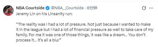 林书豪说道:“那段时间我压力巨大,不只是因为想在联盟站稳脚跟,还有沉重的经济压力——要养家糊口,还要还清家里的各种欠款和贷款。所以对我来说,这场比赛更像一场梦。当你打出生涯最疯狂的比赛时,整个人其实是失神的,根本没意识到场上发生的一切,完全进入了专注状态。”