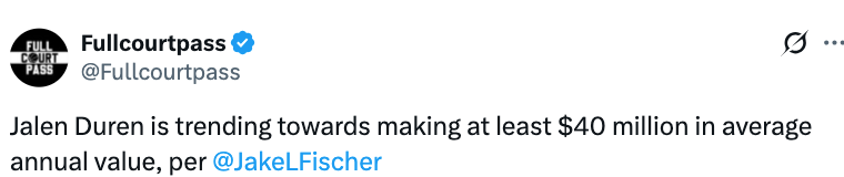 北京时间12月24日,据美记Jake Fischer报道,活塞中锋杜伦的新合同年薪预计将达到至少4000万美元。