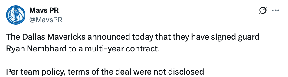 北京时间3月2日,据独行侠官方宣布,球队已经和瑞安-内姆哈德签下一份多年合同。据此前名记Shams报道,独行侠和内姆哈德签下一份新的两年合同,为了给他腾位置,独行侠裁掉了泰鲁斯-琼斯。
