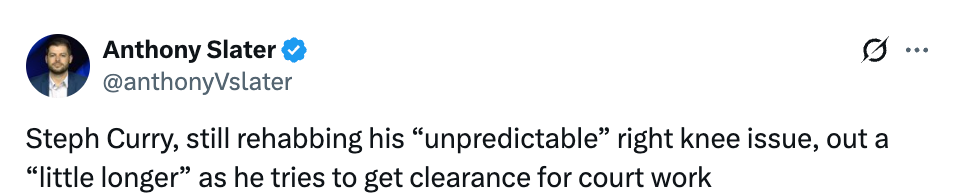 勇士在上场比赛以101-129不敌洛杉矶湖人。库里因髌股疼痛综合征(也被称为“跑步膝”)连续缺席第10场比赛,该症状通常表现为膝盖骨周围肿胀和疼痛。勇士原本对库里在全明星赛后立即复出感到乐观,但他在休赛期训练中出现伤情反复,并告知训练团队,回归球馆后还无法进行对抗训练。球队让他暂停球场训练10天。有人在湖人勇士赛前的更衣室看到他用右膝进行负重深蹲练习。球队将在晚些时间更新他的伤情,预计他还将继续缺席多场比赛。