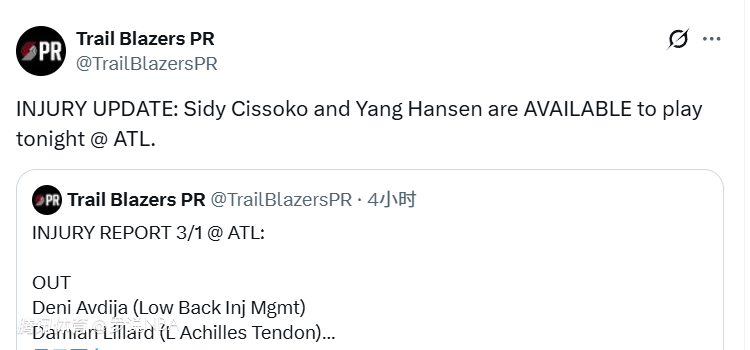 北京时间3月2日,开拓者客场对阵老鹰,这是他们背靠背的第二场比赛,昨日客场对阵黄蜂的比赛,开拓者93-109输掉比赛,杨瀚森打了最后2分15秒,得到2分1篮板。今天的比赛前,杨瀚森虽然一度因背部酸痛被列为出战成疑,但赛前官方更新伤病名单,还是显示他被激活了,可以出战。阿夫迪亚、夏普和罗威本场缺阵。