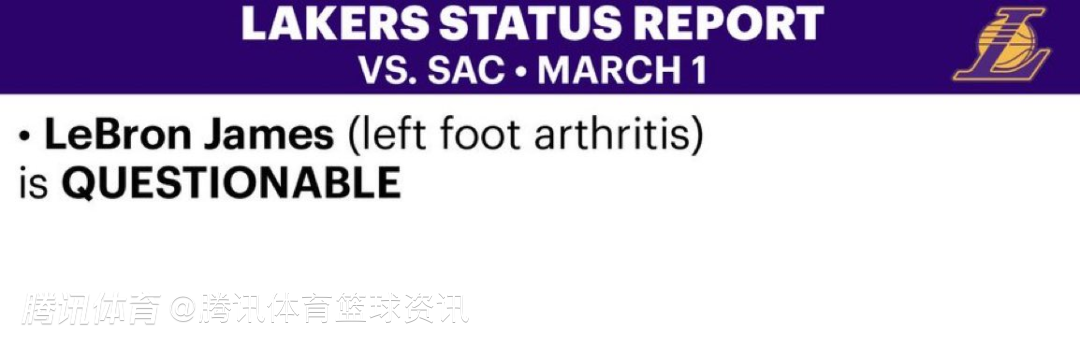 北京时间3月2日,NBA常规赛继续进行,湖人对阵国王。赛前,湖人方面更新球队本场比赛伤情报告,詹姆斯出战成疑。