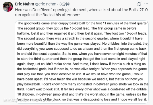 北京时间3月2日,NBA常规赛继续进行,公牛队120-97击败雄鹿队。此役,雄鹿队一度被公牛队打出27-0的攻击波,末节8-33输给对手25分。赛后,雄鹿队主教练老里弗斯接受媒体采访,谈到了此事。