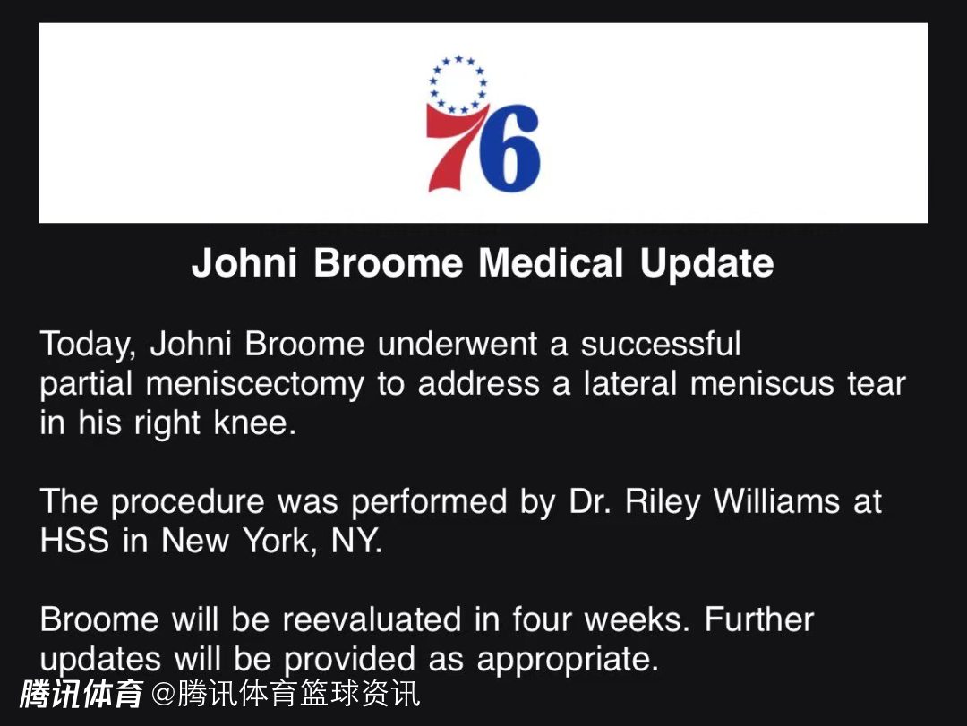 北京时间3月2日,76人队官方发布公告称,球队新秀约翰尼-布鲁姆此前已接受了右膝外侧半月板撕裂修复手术,具体为部分半月板切除术,其伤情将在四周后重新评估。
