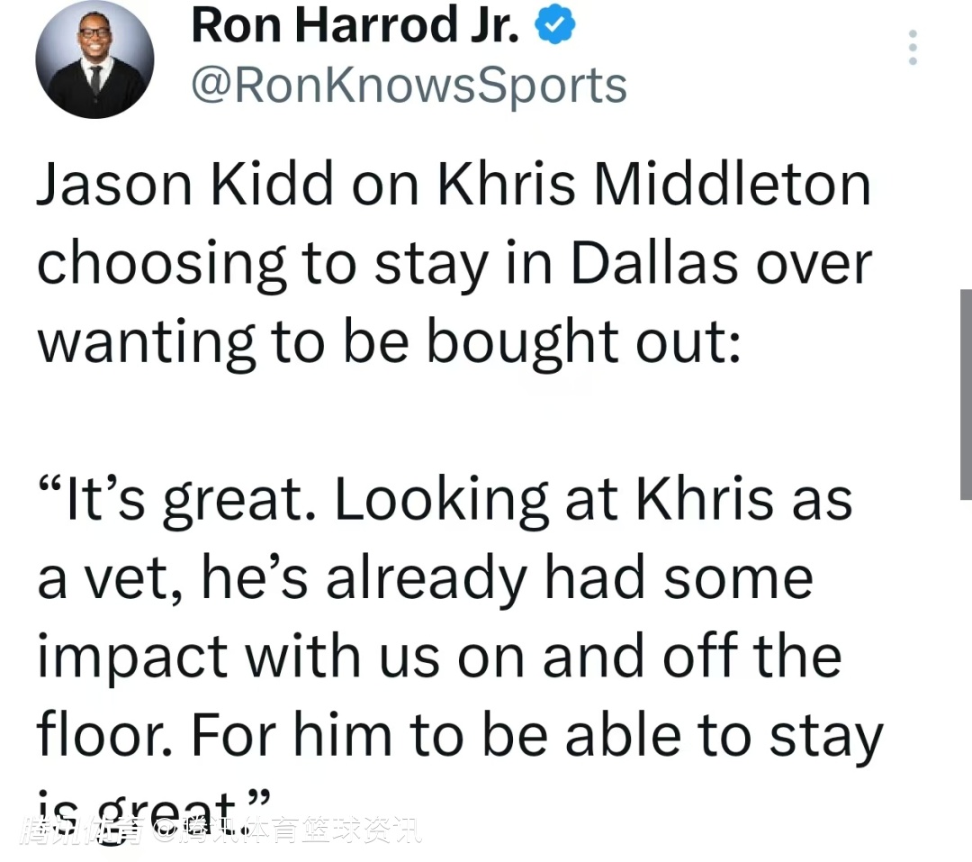 谈到米德尔顿选择留队并放弃买断,基德说道:“米德尔顿作为一名老将,无论在赛场之上还是更衣室中,都已经为球队带来了贡献。他能选择留队,对我们来说再好不过。我们不会让他每晚出战40分钟,但他身为老将的得分能力和领导力,正是球队更衣室所需要的,所以我们很庆幸他能留下。”