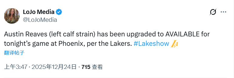 北京时间12月24日,湖人队在最新的伤病报告中确认,后卫奥斯汀-里夫斯的出战状态已升级为可以出战,他将在今日对阵太阳队的比赛中复出。