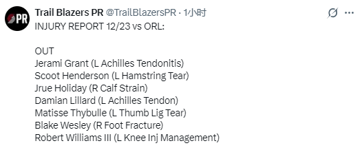 北京时间12月24日,NBA常规赛继续进行,开拓者将对阵魔术。赛前,开拓者方面公布本场比赛球队伤情报告,格兰特(左脚跟腱炎)和罗伯特-威廉姆斯(左膝伤病管理)将缺席本场比赛。中国球员杨瀚森在连续5场遭遇DNP后或将迎来上场机会。