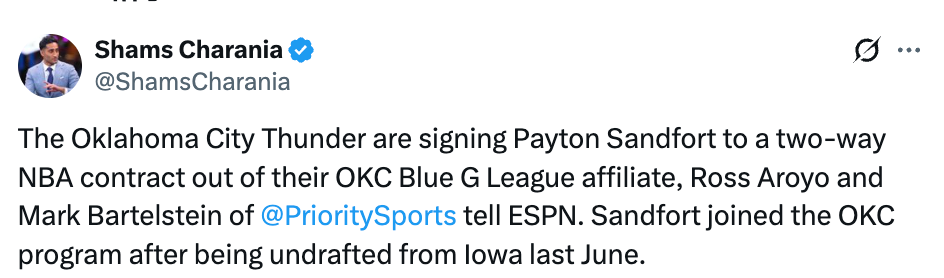 北京时间3月2日,据名记Shams报道,雷霆将签约G联盟附属球队俄克拉荷马蓝队球员佩顿-桑德福特,双方达成了一份双向合同。
