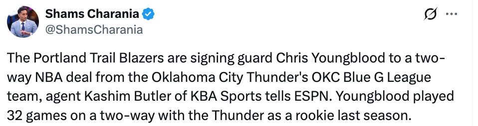 北京时间3月3日,据名记Shams报道,波特兰开拓者将签下后卫克里斯-扬布拉德,双方达成一份双向合同。杨布拉德此前效力于雷霆G联盟附属球队俄克拉荷马城蓝队。
