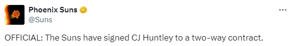 北京时间3月3日,太阳队官方今日宣布,球队以一份双向合同重新签下前锋CJ-亨特利。ESPN记者Shams率先报道了双方达成双向合同的消息。