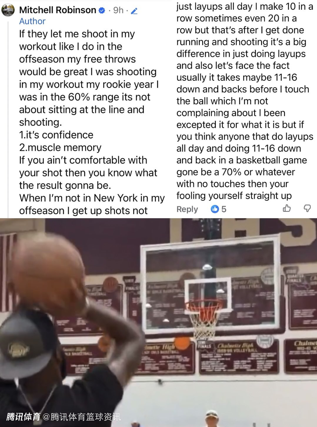 北京时间3月3日,尼克斯中锋米切尔-罗宾逊在社媒发文,谈及自己罚球命中率的话题。