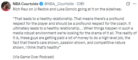 北京时间3月3日,知名经纪人里奇-保罗在直播节目中,谈到雷迪克与东契奇在场边发生争执一事。