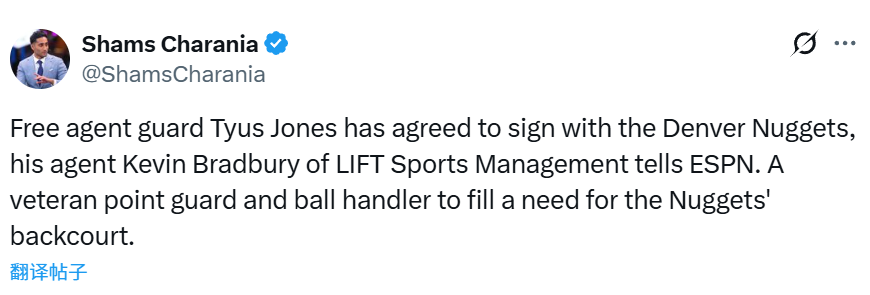 北京时间3月3日,据名记Shams报道,自由球员后卫泰鲁斯-琼斯的经纪人凯文-布拉德伯里透露,琼斯已同意签约丹佛掘金。这位经验丰富的控球后卫将补强掘金后场需求。泰鲁斯-琼斯此前希望与独行侠达成买断,从而加盟一支有季后赛竞争力的球队,并以替补身份做出贡献。