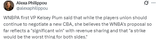 北京时间3月3日,WNBA球员工会第一副主席普拉姆表示,尽管球员工会应继续就新的劳资协议展开谈判,但她认为,WNBA目前提出的方案在收入分成方面已是一场“重大胜利”,并且“停摆对双方而言都是最糟糕的结果”。
