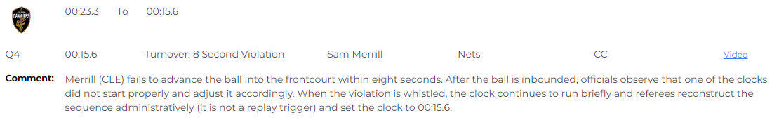 对此,裁判报告给出的解释为:梅里尔未能在8秒内将球推进至前场。球发入场内后,裁判发现其中一个计时器未正常启动,并对此进行了调整。在吹罚违例时,计时器仍短暂继续走动,裁判通过官方流程还原了时间,将时间调整为00:15.6。骑士队在比赛结束前23.3秒至15.6秒时仍未过半场,所以被吹罚8秒违例。