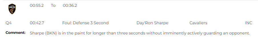 这次漏判发生在终场前36.2秒,当时夏普在三秒区内停留时间超过三秒,且并未立即对对手进行积极防守,但裁判并没有吹罚他防守三秒违例。