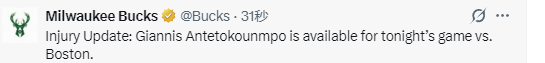 北京时间3月3日,NBA常规赛继续进行,凯尔特人队对阵雄鹿队。赛前,雄鹿队官方宣布,字母哥可以出战本场比赛。