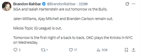北京时间3月3日,雷霆队发布了明日对阵公牛队比赛的伤病报告,包括亚历山大在内的7名球员缺席比赛,具体情况如下: