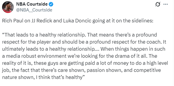 对于雷迪克和东契奇的不和一幕,詹姆斯的经纪人里奇-保罗在节目中表示:我在这行待了很长时间,球员与教练之间的争执,其实会往往导向一种健康的关系。我接触过足够多的教练,见过他们挑战队里的明星球员,老K教练在大学篮球里做过,在NBA我见过斯波这么做,见过泰伦·卢这么做,见过像帕特·莱利、史蒂夫·科尔这么做过,所有冠军教头,菲尔·杰克逊也这样。