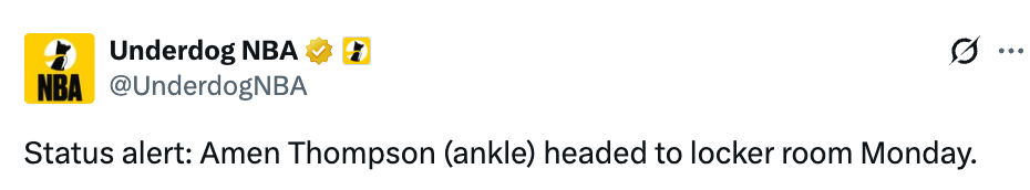 第四节还剩下8分11秒,阿门捂着自己的右脚踝,回到更衣室。在阿门伤退之前,他首发出战30分钟,投篮15中10,三分球1中1,拿到22分12篮板4助攻2抢断。