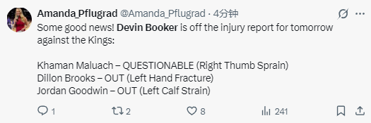 北京时间3月3日,太阳队公布了明日对阵国王队比赛的伤病报告,德文-布克和海史密斯的名字都未能出现在伤病报告当中,这也意味着,布克将迎来复出,海史密斯则有望上演太阳生涯首秀。
