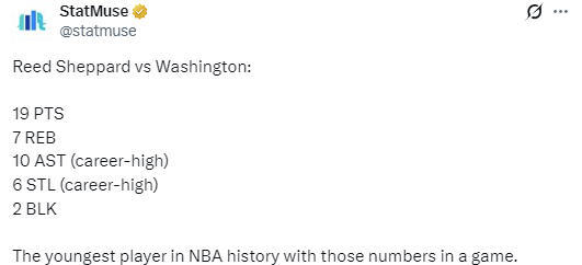 根据数据统计显示,在2000年之后能单场得到至少19分7篮板10助攻6抢断2盖帽的球员,除了今天的谢泼德之外,还有约基奇、詹姆斯-哈登和安德烈-基里连科。谢泼德也是NBA历史上能拿到上述数据的最年轻球员。
