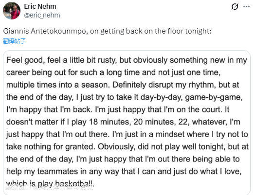 在谈到自己的复出感受时,字母哥表示:“感觉不错,就是有点生疏。职业生涯里,缺席这么久还是头一次,而且不是一次,是赛季里多次伤停。这肯定打乱了我的节奏,但说到底,我还是试着一天一天来、一场一场打。我很高兴我回来了,能站在球场上就很开心。不管是打18分钟、20分钟、22分钟还是别的,我都很开心。我现在的心态就是,不再把任何事情当成理所当然。显然我今晚打得不好,但说到底,我还是很高兴能在场上,尽我所能帮助队友,做我热爱的事,那就是打篮球。”