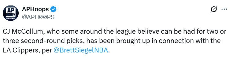 北京时间12月24日, 据名记Siegel报道,奇才的34岁后卫CJ-麦科勒姆吸引联盟多支球队关注,他的名字已经和洛杉矶快船队联系在了一起。