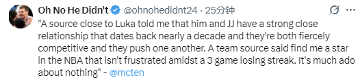 该记者表示:“一位接近东契奇的消息人士告诉我,他和雷迪克关系非常好,两人相识近十年,都极具好胜心,彼此互相激励。一位球队内部人士则表示,你在NBA里找不出哪位球星在三连败期间会不感到沮丧的,这事儿纯属小题大做。”