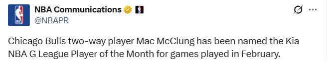 北京时间3月4日,NBA官方宣布,芝加哥公牛队的双向球员麦克朗当选二月份G联赛的月度最佳球员。
