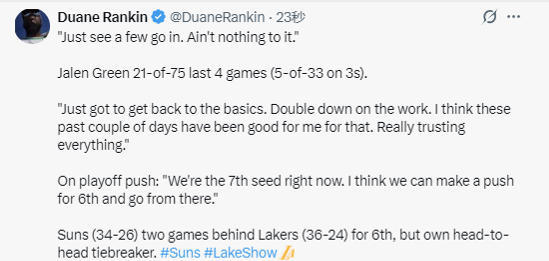 在过去4场比赛中,杰伦-格林总计75投21中,其中三分球33投5中,在谈到此事时,杰伦-格林表示:“就是投进的球有点少而已,没什么大不了的。我得打好基础,加倍努力训练。过去几天我一直在这么做,目前感觉还不错,我对一切都充满信心。”
