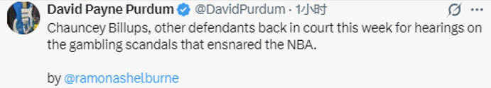 北京时间3月4日,NBA名记Ramona shelburne发文,透露昌西-比卢普斯及其他被告将于本周重返法庭,就这起牵连NBA的赌博丑闻出席听证会。