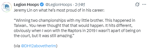林书豪表示:“和我的弟弟一起拿下两座总冠军。这发生在中国台湾,你根本想不到会有这样的事。这种感觉很不一样。显然,2019年我随猛龙夺冠时,我并没有在场上真正参与其中,但那依然很不可思议。”