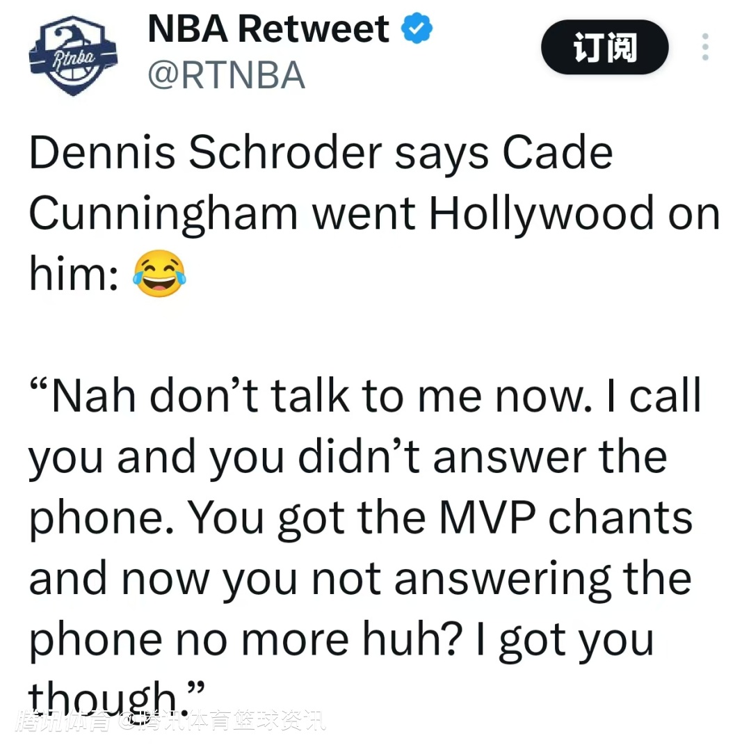 施罗德调侃前队友坎宁安飘了、成好莱坞大明星了:“行了啊,现在别跟我装没事。我之前给你打电话你不接,现在有人喊你MVP了,就不接我电话了是吧?行,我记住你了。”