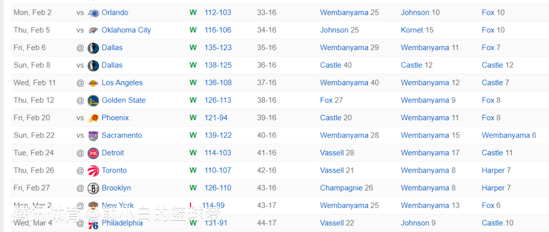 这场比赛后马刺队最近的13场比赛赢下了其中的12场,雷霆、魔术、湖人、太阳、勇士、活塞、猛龙、费城都是强队,马刺这一波的含金量很高。