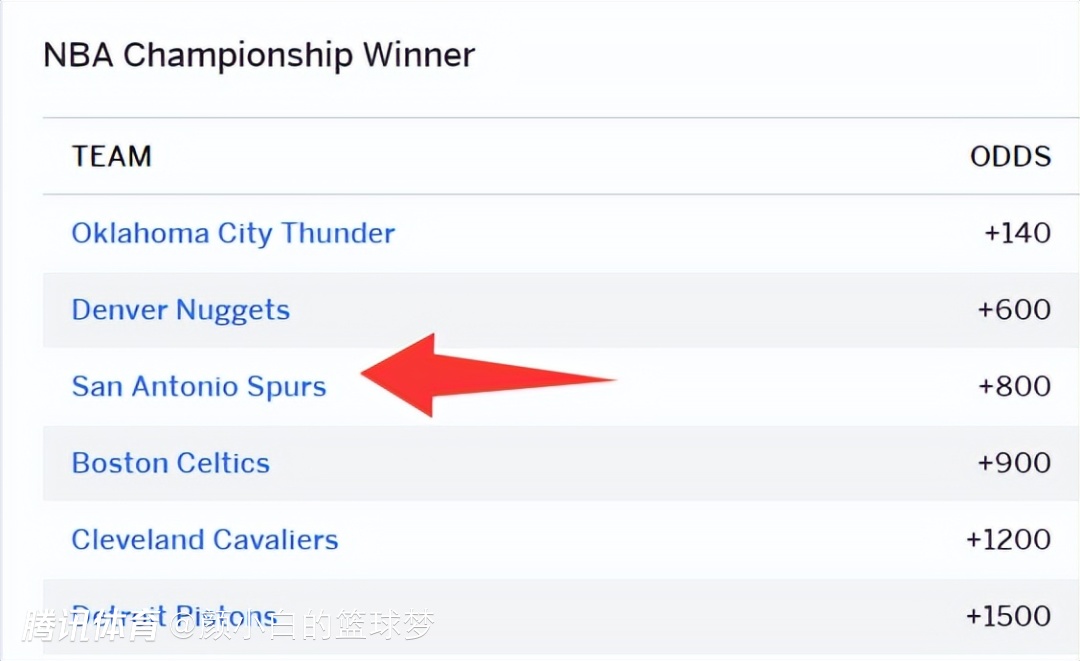 如今的马刺队夺冠赔率已经升至第三,雷霆+140、掘金+600、马刺+800。没想到马刺从摆烂的球队一下就变成了冲冠豪强了。