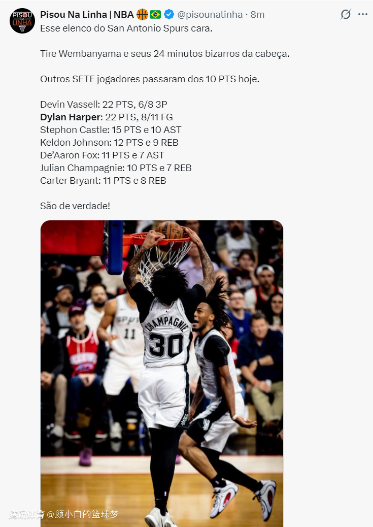 这场比赛马刺全队八人得分上双,文班亚马24分钟拿到10分8篮板4助攻3抢断6盖帽,福克斯11分7助攻5篮板1抢断,卡斯尔15分10助攻4篮板,瓦塞尔22分5篮板,上叛逆10分7篮板,凯尔登12分9篮板,哈珀22分,卡布11分9篮板。