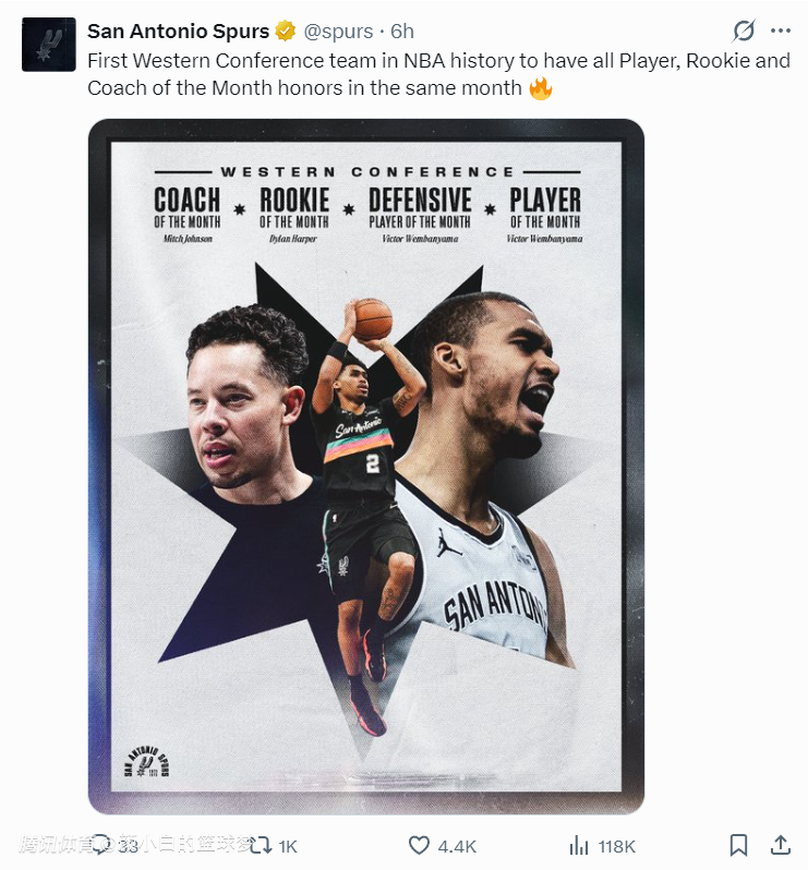 这场比赛之前,二月的西部月最佳教练是米奇,西部月最佳防守球员是文班亚马,西部月最佳新秀是哈珀,榜眼秀哈珀二月场均12.5分4.9个助攻,投篮命中率55.4%,在弗拉格伤停时抢下了一次西部月最佳新秀,此役哈珀的表现更为出色,不得不说这支马刺队的天赋已经溢出。