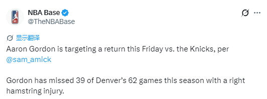 北京时间3月4日,据记者Sam Amick报道,掘金球星戈登计划在本周六对阵尼克斯的比赛中复出。本赛季,戈登因右腿筋伤势缺席了掘金62场比赛中的39场。
