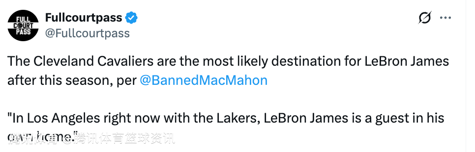 北京时间3月4日,据美记麦克马洪报道,克利夫兰骑士队是詹姆斯本赛季结束后最有可能的下家。他表示:“如今在洛杉矶湖人,詹姆斯就像是自己家里的客人。”