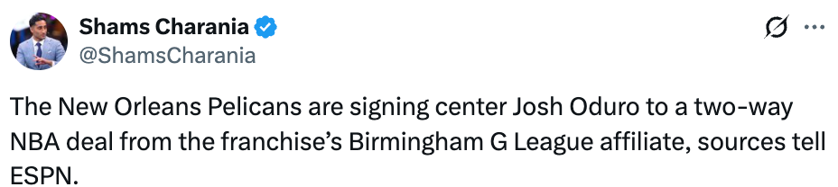 北京时间3月4日,据名记Shams报道,鹈鹕将和效力球队G联盟附属球队伯明翰中队的内线约什-奥杜罗签下一份双向合同。