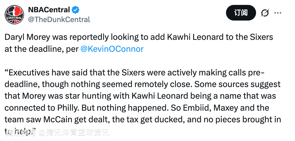 奥康纳表示:“多位高管透露,76人队在截止日前积极致电询价,但没有任何一笔交易接近达成。有消息源指出,莱昂纳德是和76人传出绯闻的名字之一。但最终什么都没发生。恩比德、马克西和球队看着麦凯恩被送走、避开了奢侈税,却没有引进任何能提供帮助的球员。”