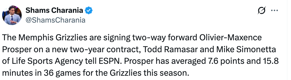 北京时间3月5日,据名记Shams报道,灰熊将和双向合同球员普罗斯珀签下一份为期2年的新合同。