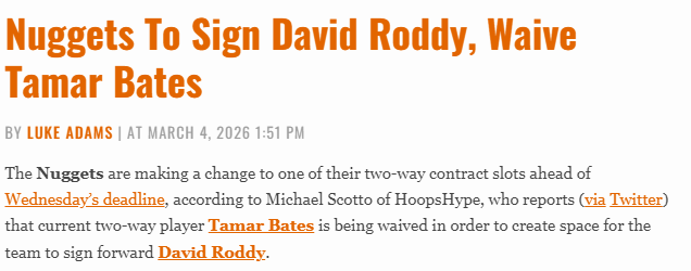 北京时间3月5日,据记者Michael Scotto报道,掘金队将裁掉现双向合同球员塔马尔-贝茨,为签下大卫-罗迪腾出名额。