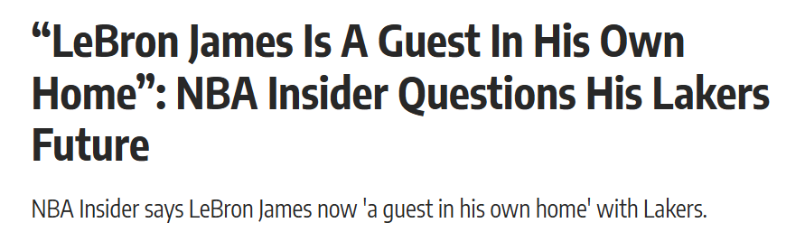 麦克马洪在节目上说道:“(詹姆斯)最有可能的下家是克利夫兰。想想这个剧本:回家、重聚、故乡之子最后一舞、史诗级的退役巡演,还能为一支争冠球队效力。再看看现在的湖人,詹姆斯在自己的地盘反倒像个客人。”